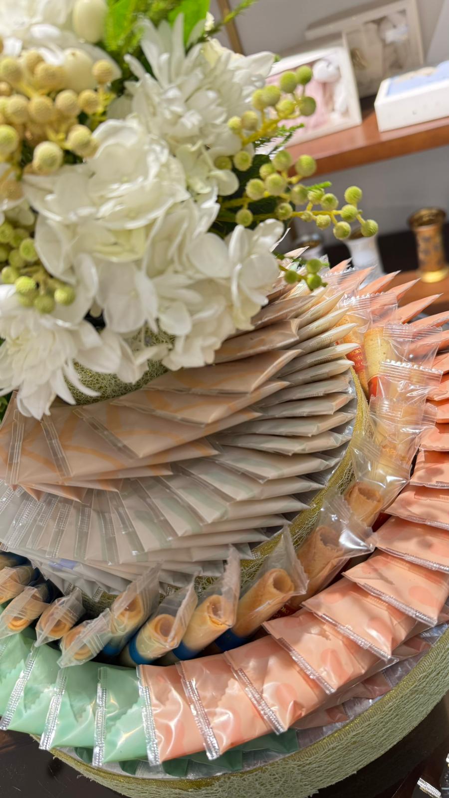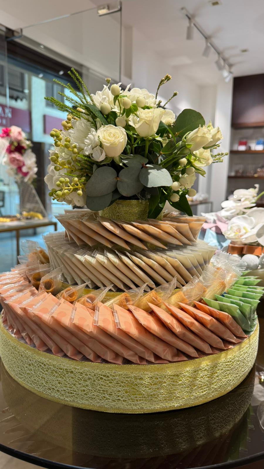 A 300 pcs. luxurious 3-tier YOKU MOKU assortment, beautifully arranged with fresh blooms- perfect for gifting and special celebrations.